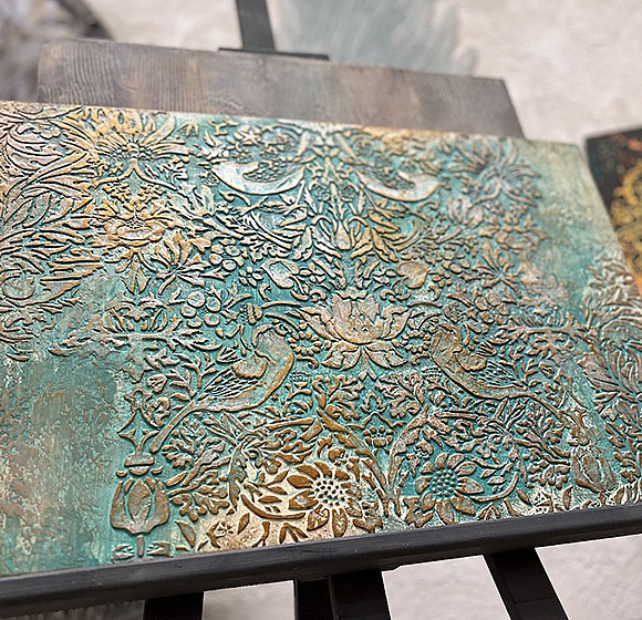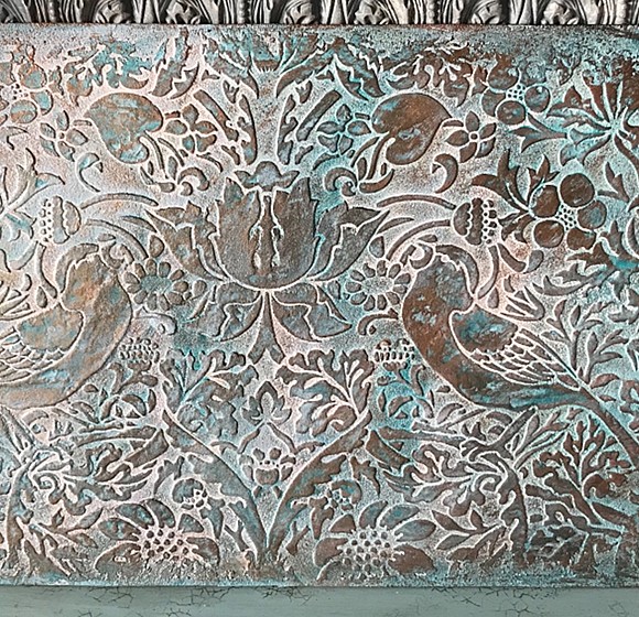 Если полученный результат не достаточно яркий и смелый, можно добавить заколерованные лессирующие составы. Наносим яркий глянцевый воск и стираем излишки, чтобы в рельефе создалась бирюзовая патина.